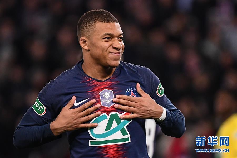 4月3日,巴黎圣日耳曼队球员姆巴佩在比赛中庆祝进球。 当日,在2018-2019赛季法国杯半决赛中,巴黎圣日耳曼队主场以3比0战胜南特队,晋级决赛。 新华社/法新社