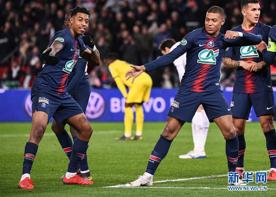 巴黎圣日耳曼队球员姆巴佩(右二)与队友在比赛中庆祝进球。新华社/法新社