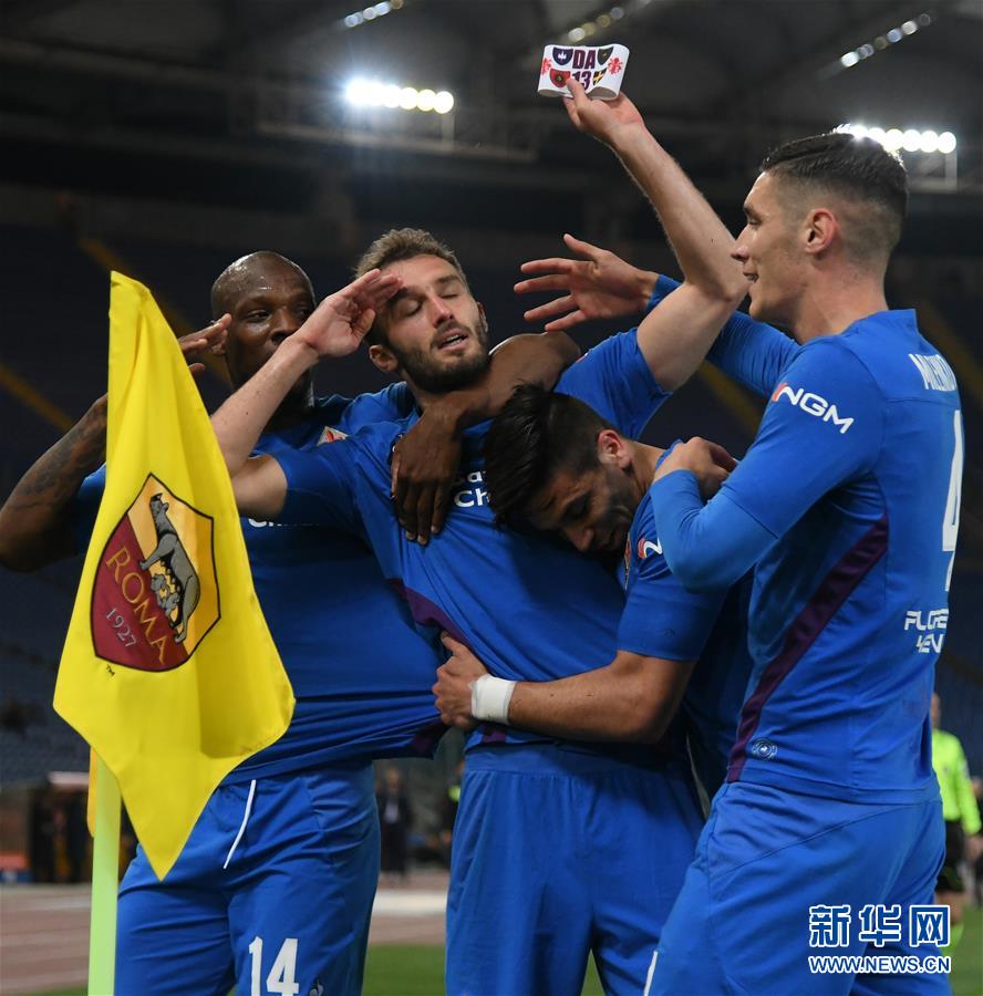 4月3日,佛罗伦萨队球员佩泽拉(左二)庆祝进球。 当日,在2018-2019赛季意大利足球甲级联赛第30轮比赛中,罗马队主场以2比2战平佛罗伦萨队。 新华社发