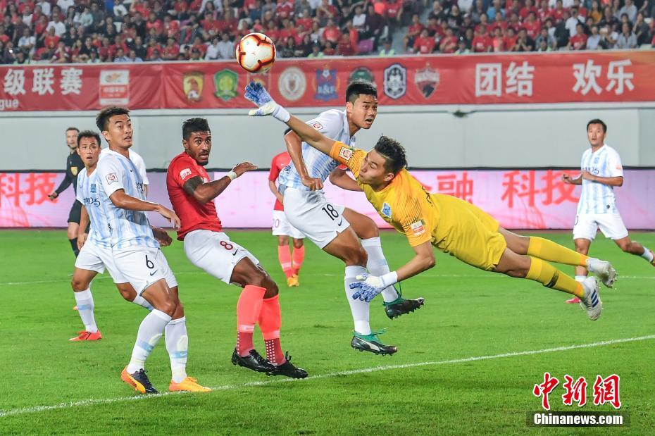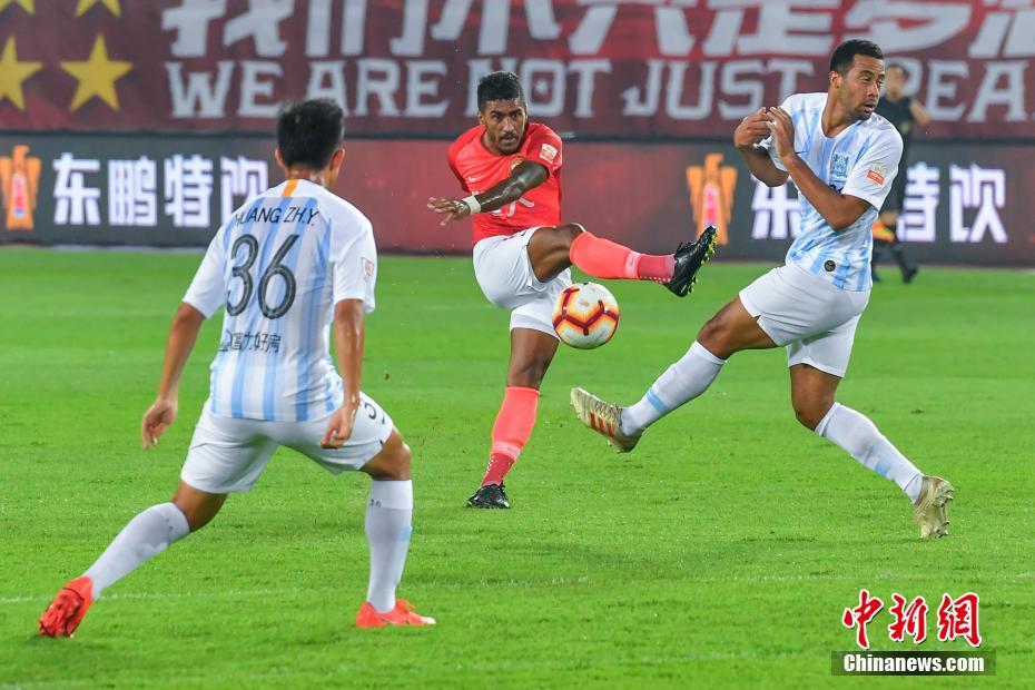 4月6日晚,2019赛季中超联赛第4轮赛事上演广州德比战,广州恒大淘宝主场迎战广州富力。最终,恒大淘宝2比0胜富力,取得联赛4连胜且保持0失球。图为广州恒大淘宝球员保利尼奥在比赛中射门。中新社记者 陈骥旻 摄