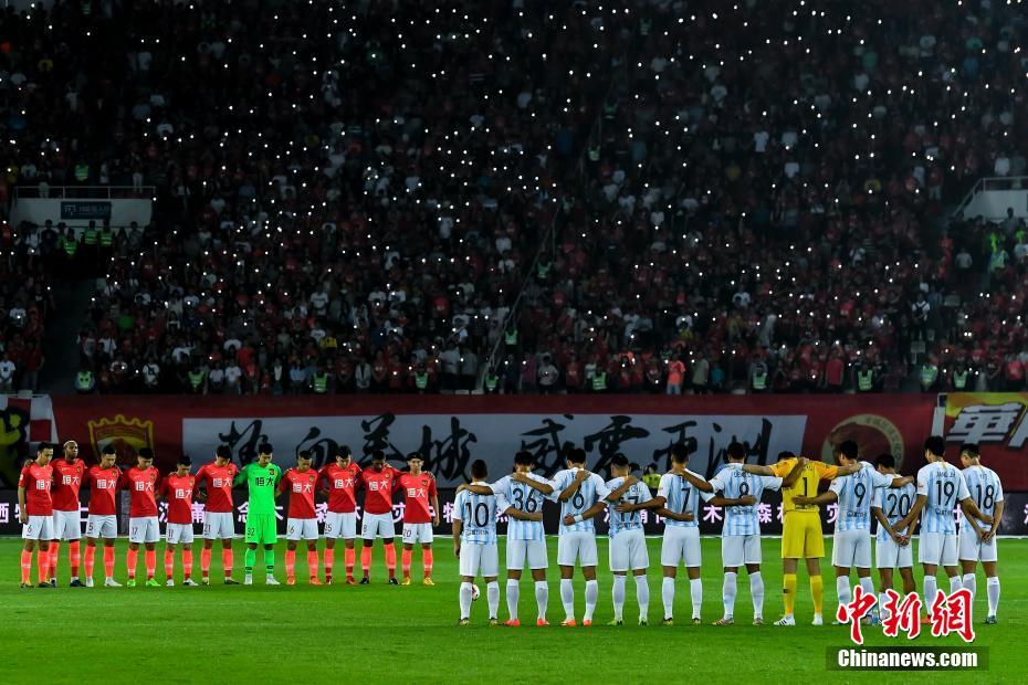 4月6日晚,2019赛季中超联赛第4轮赛事上演广州德比战,广州恒大淘宝主场迎战广州富力。最终,恒大淘宝2比0胜富力,取得联赛4连胜且保持0失球。图为广州恒大淘宝、广州富力球员与全场球迷默哀悼念在四川木里森林火灾扑救中英勇牺牲的烈士。中新社记者 陈骥旻 摄