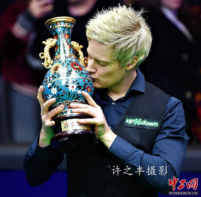 4月7日晚,2019年星牌集团世界斯诺克中国公开赛在奥体中心体育馆落幕,在决赛中罗伯逊以11比4战胜利索夫斯基赢得冠军,并收获22万5千镑冠军奖金。这是罗伯逊第二次夺得中国公开赛冠军,个人生涯第16个排名赛冠军。工人日报-中工网许之丰摄影报道