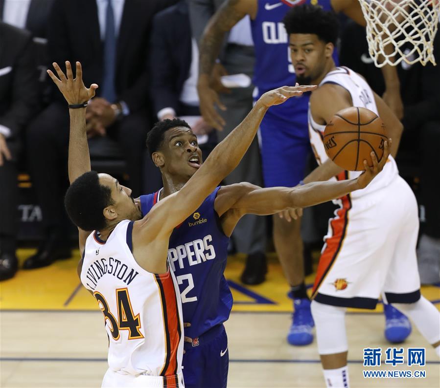 4月7日,快船队球员谢伊·吉尔杰斯·亚历山大(中)在比赛中突破上篮。 当日,在2018-2019赛季NBA常规赛中,金州勇士队主场以131比104胜洛杉矶快船队。 新华社发(董旭东摄)