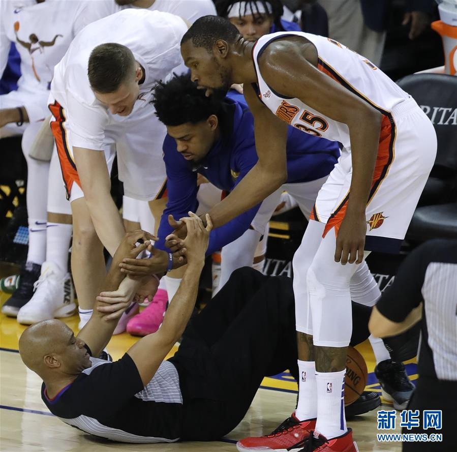 勇士队球员杜兰特(右)在比赛中扶起倒地的裁判。新华社发(董旭东摄)