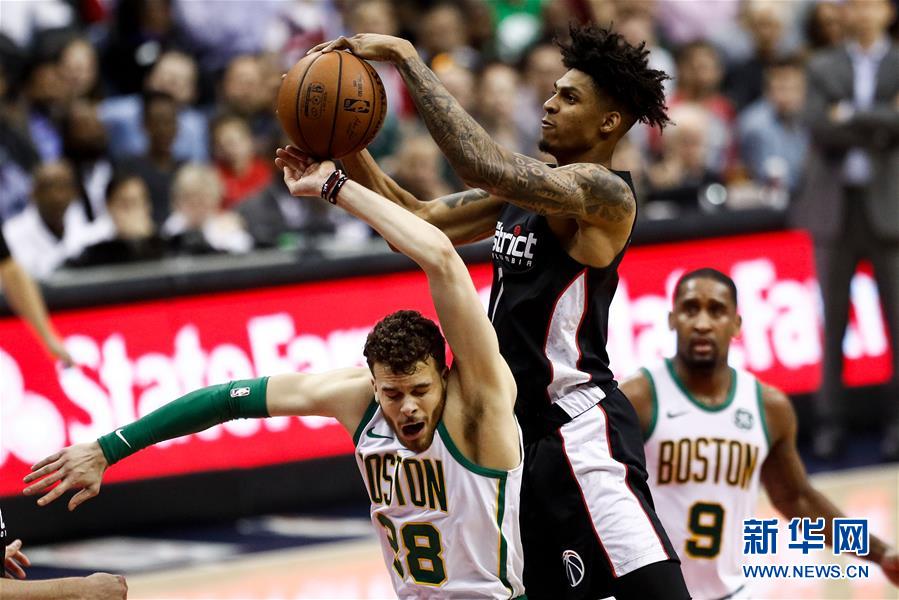 奇才队球员罗宾逊(中)与凯尔特人队球员亨特(左)在比赛中争抢篮板球。新华社发(沈霆摄)