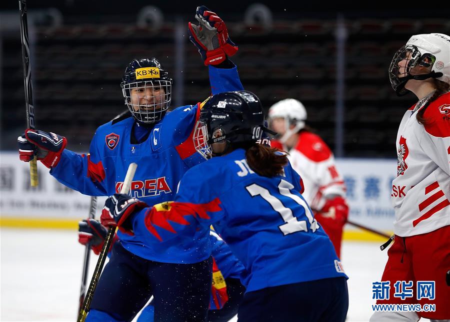 4月9日,韩国队球员在比赛中庆祝进球。 当日,在北京举行的2019年国际冰联女子冰球世界锦标赛甲级B组比赛中,韩国队以4比3战胜波兰队。 新华社记者王丽莉摄