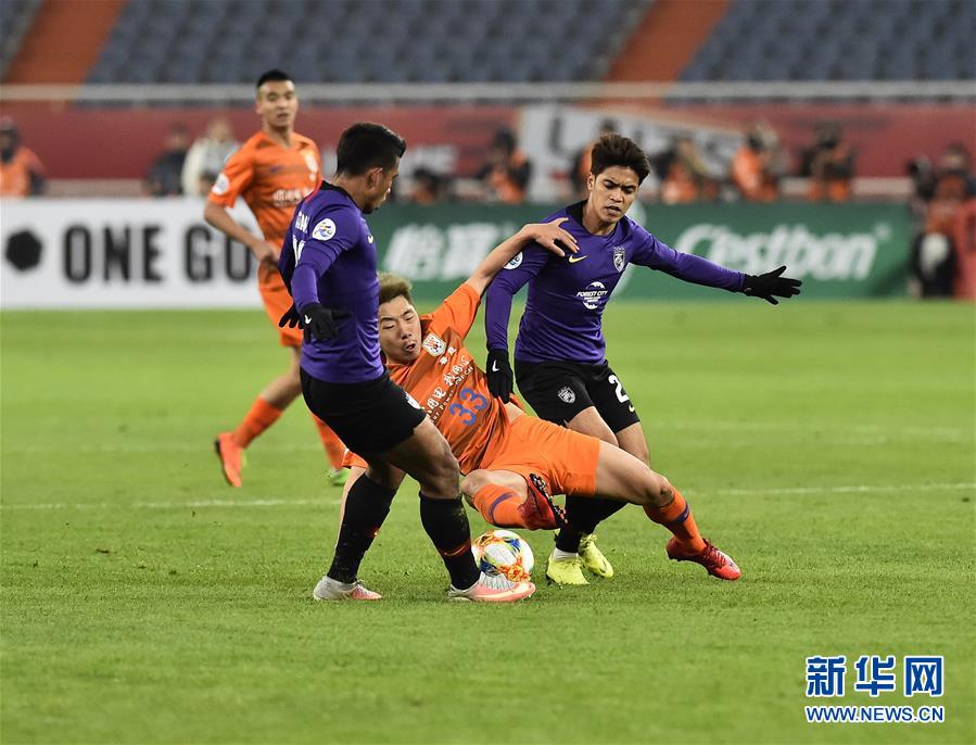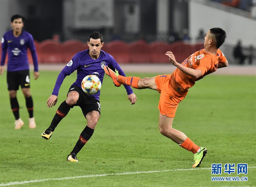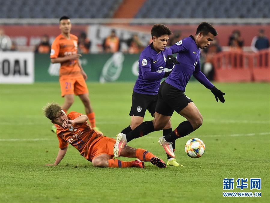 山东鲁能泰山队球员金敬道(左一)在比赛中抢球。新华社记者王凯摄