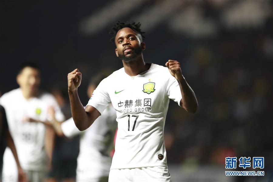 4月9日,北京中赫国安球员巴坎布在比赛中庆祝进球。当日,在泰国武里南进行的2019亚洲足球冠军联赛G组第三轮比赛中,北京中赫国安队客场以3比1战胜泰国武里南联队。 新华社记者张可任摄