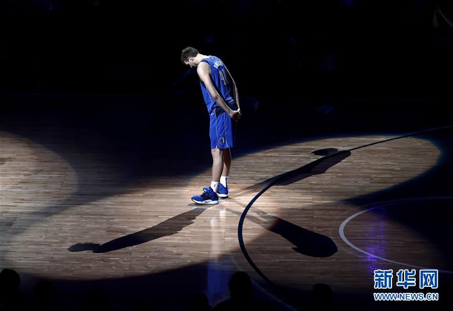 4月9日,独行侠队球员诺维茨基赛后向观众致意。 当日,在2018-2019赛季NBA常规赛中,达拉斯独行侠队主场以120比109战胜菲尼克斯太阳队。比赛结束后,独行侠队球员诺维茨基正式宣布自己将在本赛季结束后退役。 新华社/美联社