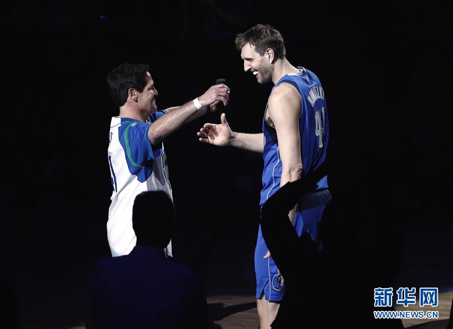 独行侠队球员诺维茨基(右)在赛后仪式上与球队老板库班致意。新华社/美联社