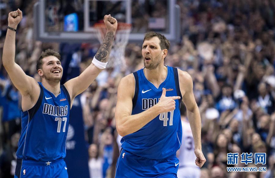 独行侠队球员诺维茨基(右)在比赛中庆祝。新华社/路透社