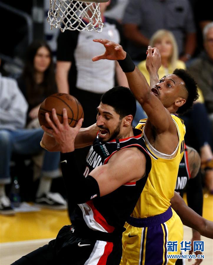 4月9日,开拓者队球员坎特(左)与湖人队球员乔纳森·威廉姆斯在比赛中拼抢。 当日,在2018-2019赛季NBA常规赛中,洛杉矶湖人队主场以101比104不敌波特兰开拓者队。 新华社发(赵汉荣摄)