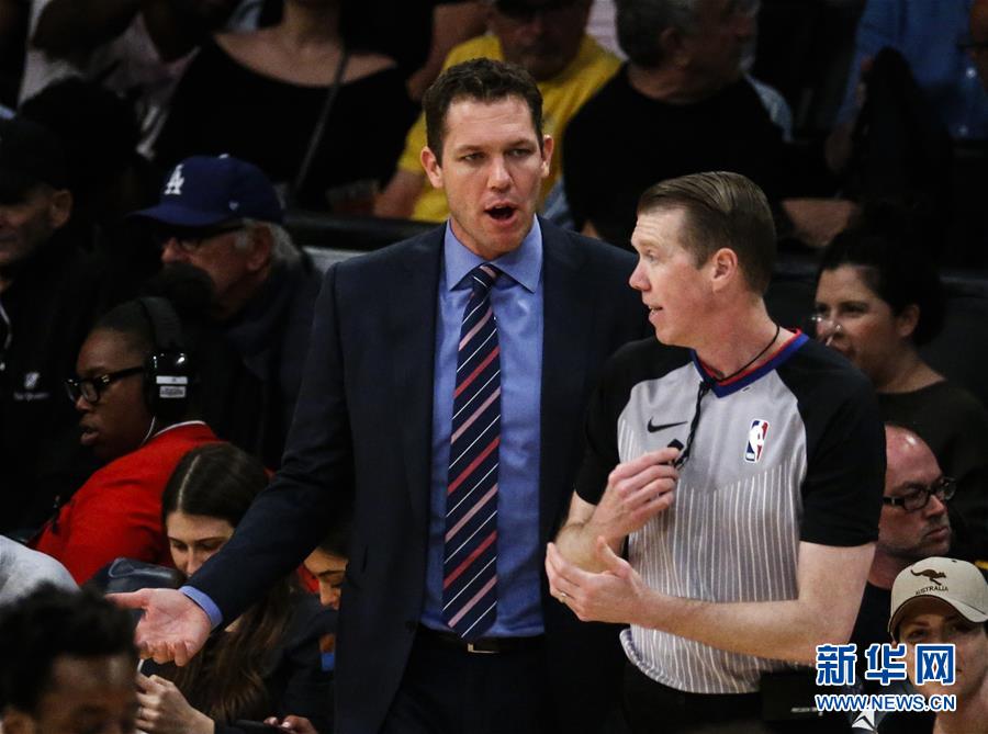 湖人队主教练沃顿(左)在比赛中质疑裁判的判罚。新华社发(赵汉荣摄)