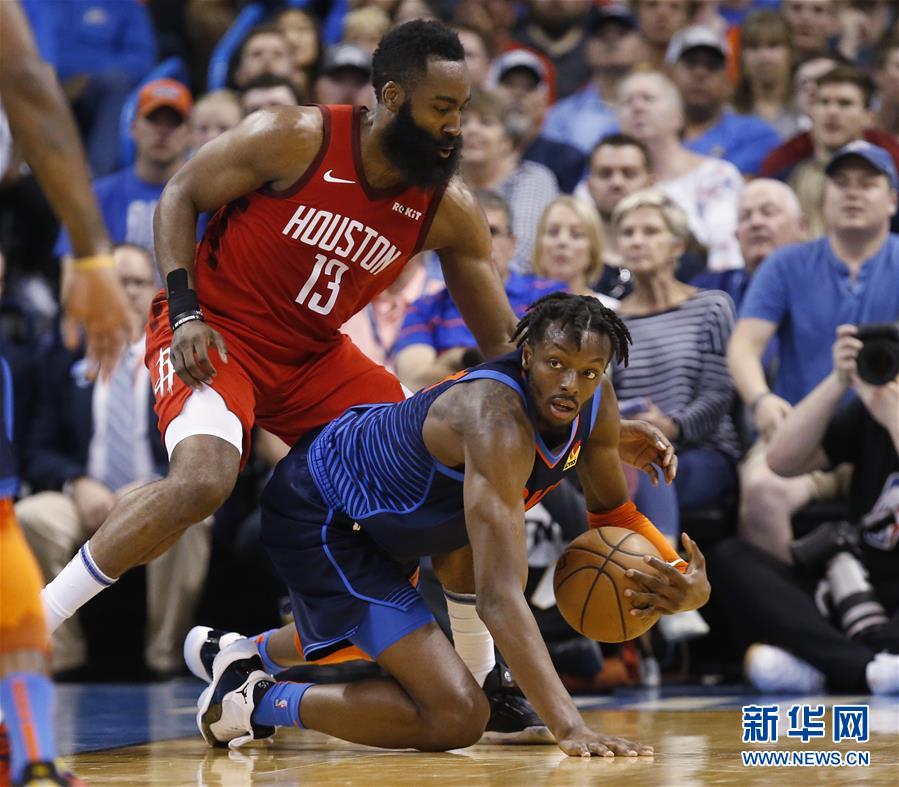 4月9日,火箭队球员哈登(上)与雷霆队球员格兰特在比赛中拼抢。 当日,在2018-2019赛季NBA常规赛中,俄克拉荷马雷霆队主场以112比111战胜休斯敦火箭队。 新华社/美联社