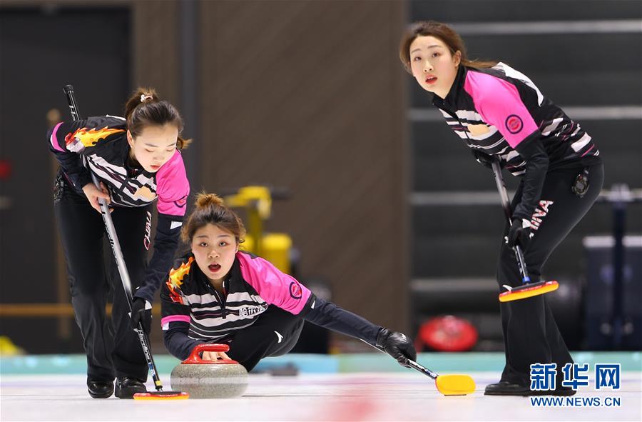 4月10日,哈尔滨四队选手董子齐(中)、张丽君(右)在比赛中。最终,哈尔滨四队以6比7不敌哈尔滨三队。 当日,2018-2019年度全国冰壶冠军赛在北京首钢园运动中心冰壶馆开赛。 新华社发(雒圆摄)