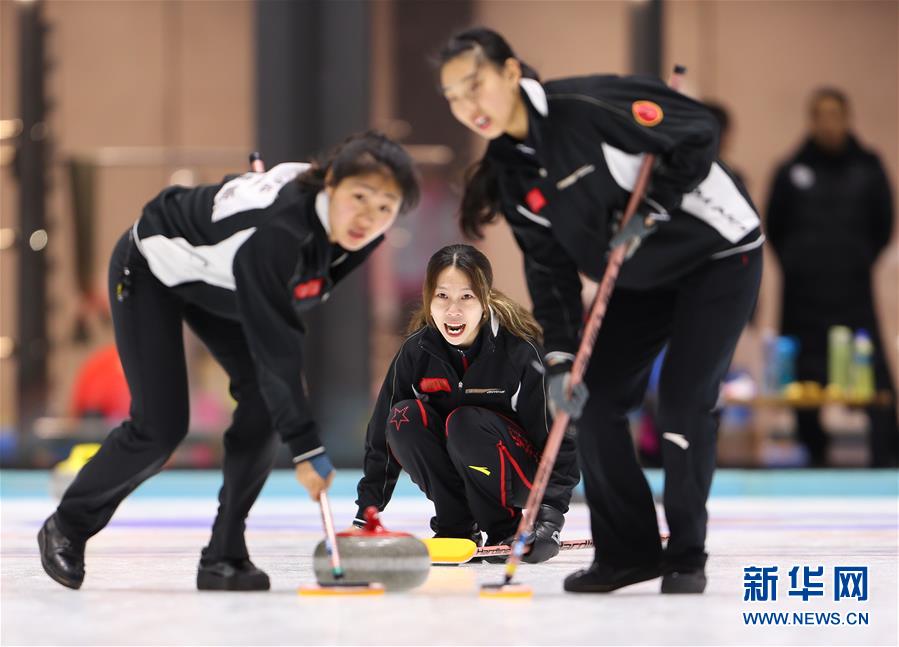 4月10日,吉林市一队选手韩丝雨(中)在比赛中。最终,吉林市一队以7比4战胜哈尔滨五队。 当日,2018-2019年度全国冰壶冠军赛在北京首钢园运动中心冰壶馆开赛。 新华社发(雒圆摄)