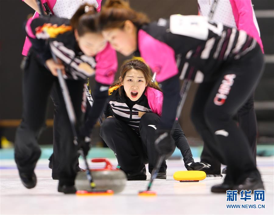 4月10日,哈尔滨四队选手张丽君(中)在比赛中。最终,哈尔滨四队以6比7不敌哈尔滨三队。 当日,2018-2019年度全国冰壶冠军赛在北京首钢园运动中心冰壶馆开赛。 新华社发(雒圆摄)