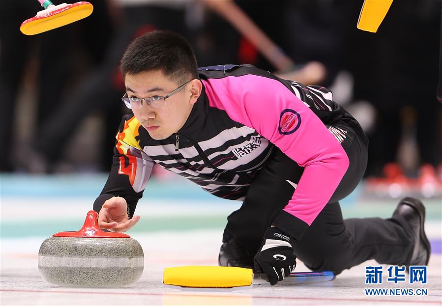 4月10日,哈尔滨五队选手王靖元在比赛中掷壶。 当日,2018-2019年度全国冰壶冠军赛在北京首钢园运动中心冰壶馆开赛。 新华社发(雒圆摄)