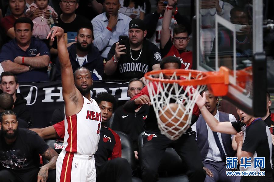 4月10日,热火队球员韦德在比赛中投篮。 当日,在2018-2019赛季NBA常规赛中,布鲁克林篮网队主场以113比94战胜迈阿密热火队。本场比赛是热火队球员韦德16年NBA生涯最后一战。 新华社记者李木子摄