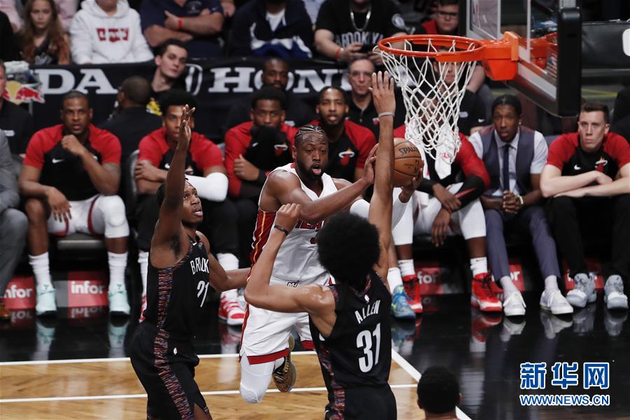 热火队球员韦德(中)在比赛中突破。新华社记者李木子摄