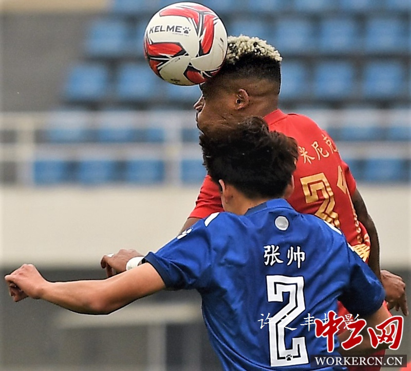 2019年4月13日下午,北京奥体中心体育场,中甲联赛第五轮比赛北京北体大1比0战胜石家庄永昌。比赛进行到第66分钟,北京北体大队外援多米尼克打入全场唯一进球,主教练高洪波执教的北体大队终于迎来了本赛季的首场胜利。图为双方的比赛。工人日报-中工网许之丰摄影报道