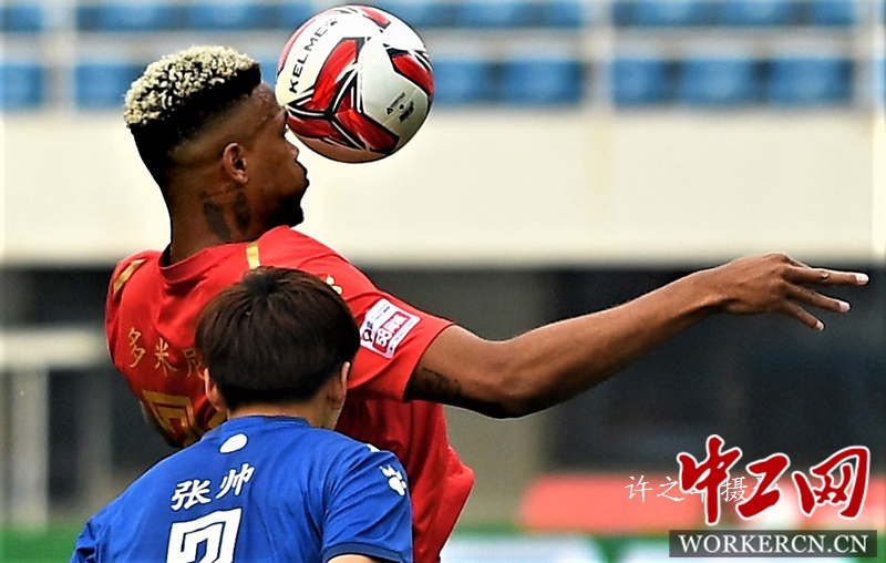 2019年4月13日下午,北京奥体中心体育场,中甲联赛第五轮比赛北京北体大1比0战胜石家庄永昌。比赛进行到第66分钟,北京北体大队外援多米尼克打入全场唯一进球,主教练高洪波执教的北体大队终于迎来了本赛季的首场胜利。图为双方的比赛。工人日报-中工网许之丰摄影报道