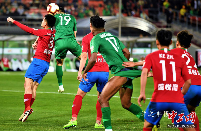 4月14日晚,2019赛季中超联赛第五轮比赛,北京中赫国安主场2比1战胜河南建业。比赛进行第52分钟,国安队进攻中建业后卫张文涛手球,主裁判在视频裁判提醒下判定点球,奥古斯托操刀命中。第68分钟,李可打入了归化球员在中超的首粒入球。第72分钟,建业队奥汉德扎点球破门。目前国安队取得开季5连胜独领积分榜首。图为双方的比赛瞬间。工人日报-中工网许之丰摄影报道