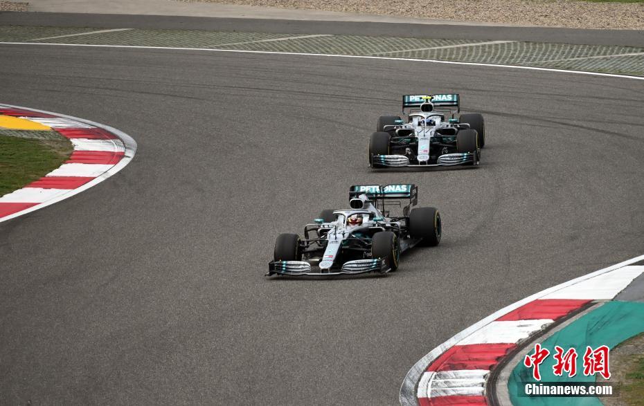 图为汉密尔顿(前)和队友芬兰车手博塔斯驾车在比赛中。 中新社记者 侯宇 摄