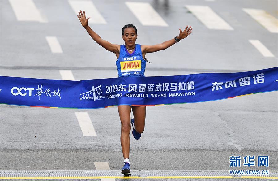 4月14日,埃塞俄比亚选手金马在比赛中冲线,她以2小时28分25秒的成绩获得了女子全程马拉松冠军。 当日,2019武汉马拉松比赛鸣枪开跑。 新华社记者熊琦摄