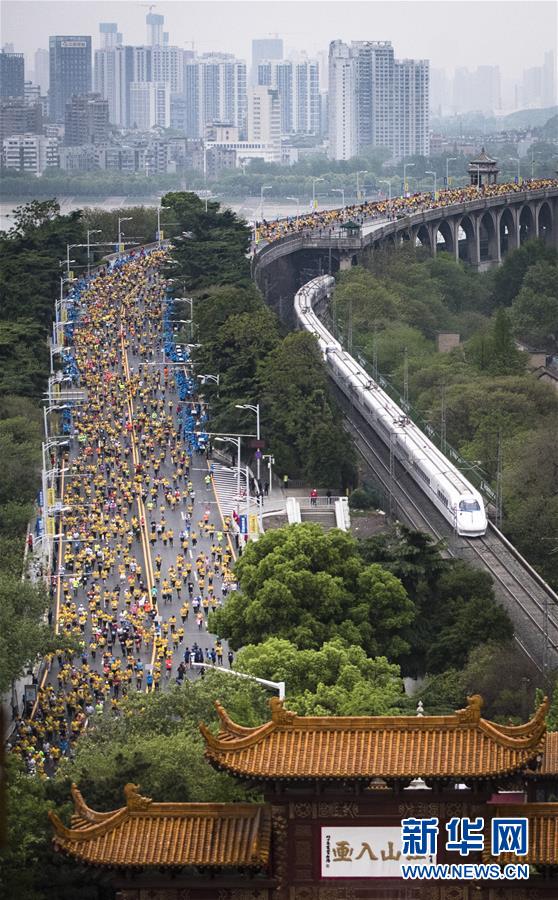 参赛选手经过武汉长江大桥。新华社记者肖艺九摄