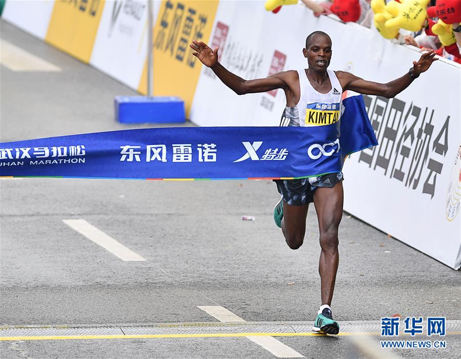 肯尼亚选手安德鲁在比赛中冲线,他以2小时10分06秒的成绩获得了男子全程马拉松冠军。新华社记者熊琦摄