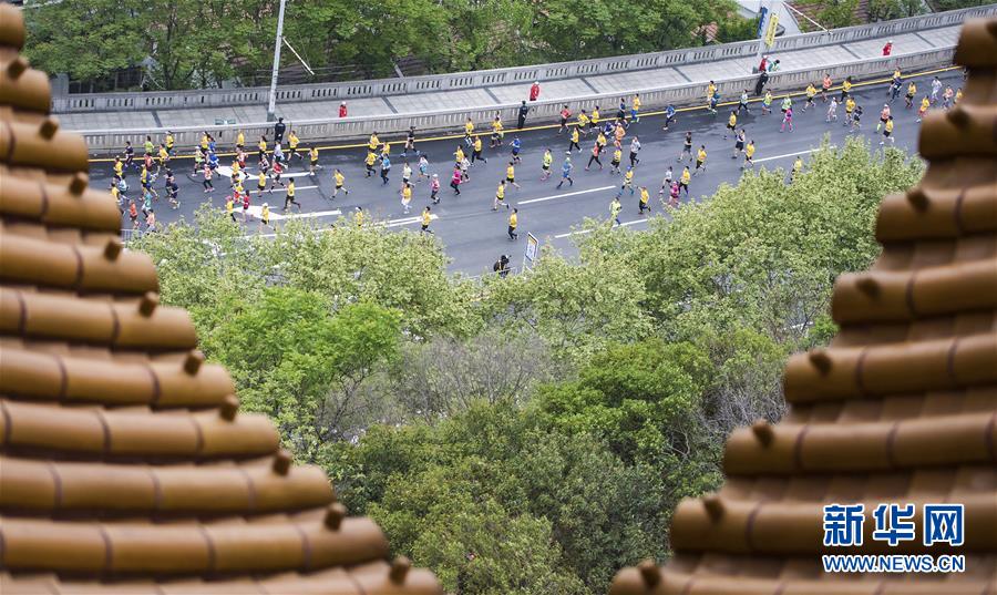 参赛选手经过黄鹤楼景区。新华社记者肖艺九摄