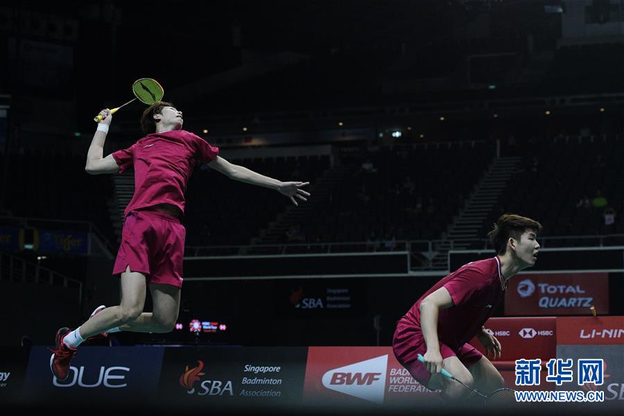 4月13日,中国选手李俊慧(左)/刘雨辰在比赛中。 当日,在新加坡室内体育场举行的新加坡羽毛球公开赛男双半决赛中,中国选手李俊慧/刘雨辰以0比2不敌印度尼西亚选手阿山/亨德拉,无缘决赛。 新华社发 (邓智炜摄)