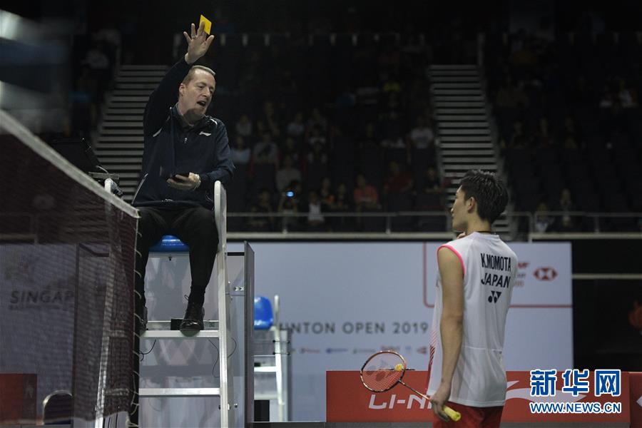 4月13日,日本选手桃田贤斗(右)在比赛中被罚黄卡。 当日,在新加坡室内体育场举行的新加坡羽毛球公开赛男子单打半决赛中,日本选手桃田贤斗以2比0战胜丹麦选手安塞龙,晋级决赛。 新华社发 (邓智炜摄)