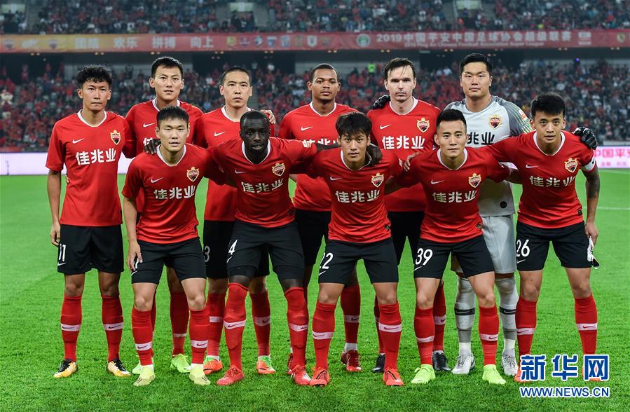 4月13日,深圳佳兆业队首发球员赛前合影。当日,在2019中国足球协会超级联赛第五轮比赛中,深圳佳兆业队主场以0比2不敌江苏苏宁易购队。新华社记者毛思倩摄
