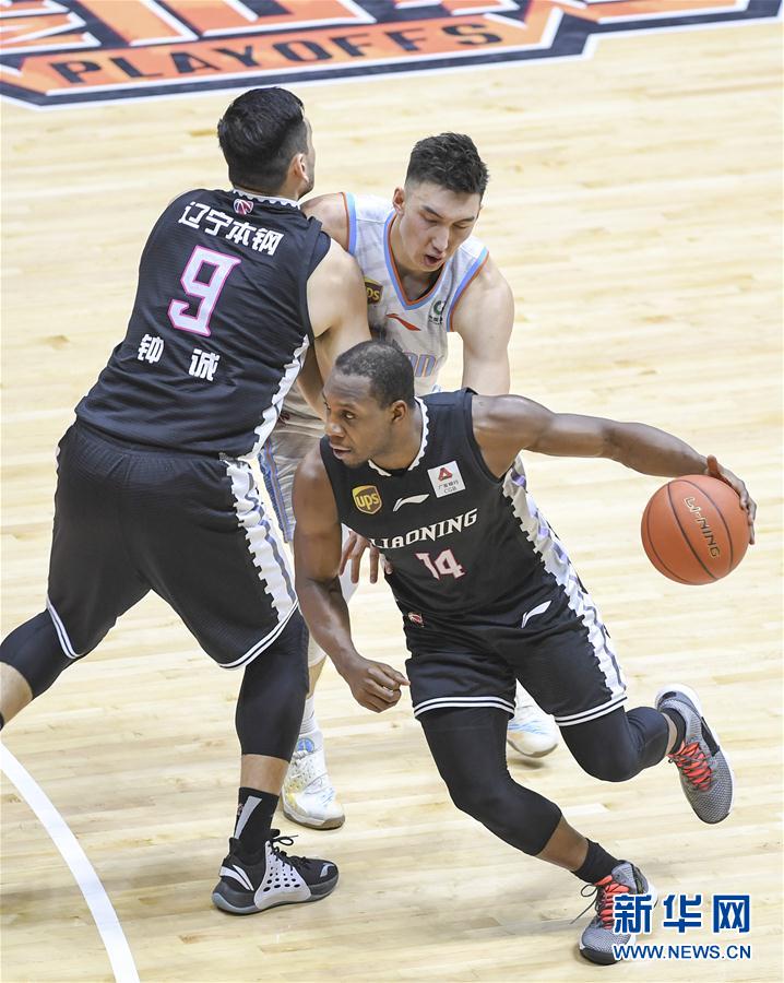 4月16日,辽宁本钢队球员哈德森(前右)在比赛中持球突破新疆广汇汽车队球员可兰白克(中)的防守。 当日,在2018-2019赛季中国男子篮球职业联赛(CBA)半决赛第四回合比赛中,新疆广汇汽车队主场以107比81战胜辽宁本钢队,总比分战成3比1。 新华社记者胡虎虎摄