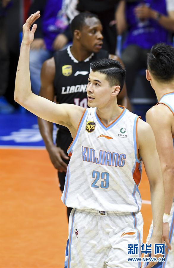 4月16日,新疆广汇汽车队球员阿不都沙拉木与球迷互动,庆祝得分。 当日,在2018-2019赛季中国男子篮球职业联赛(CBA)半决赛第四回合比赛中,新疆广汇汽车队主场以107比81战胜辽宁本钢队,总比分战成3比1。 新华社记者胡虎虎摄