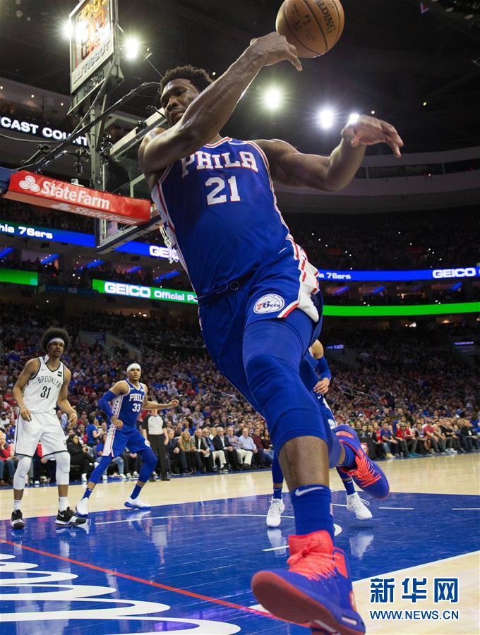 76人队球员恩比德在比赛中救球。新华社/路透社