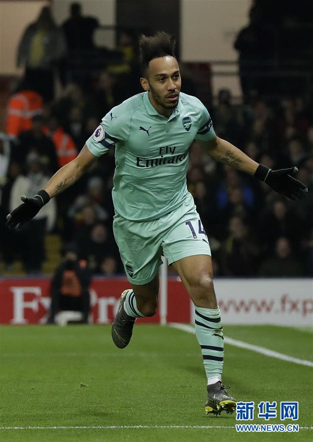 4月15日,阿森纳队球员奥巴梅扬在比赛中庆祝进球。 当日,在2018-2019赛季英格兰足球超级联赛第34轮比赛中,阿森纳队客场以1比0战胜沃特福德队。 新华社/美联社