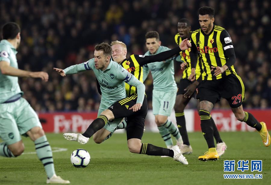 阿森纳队球员拉姆塞(左二)在比赛中和沃特福德队球员休斯(左三)拼抢。新华社/美联社