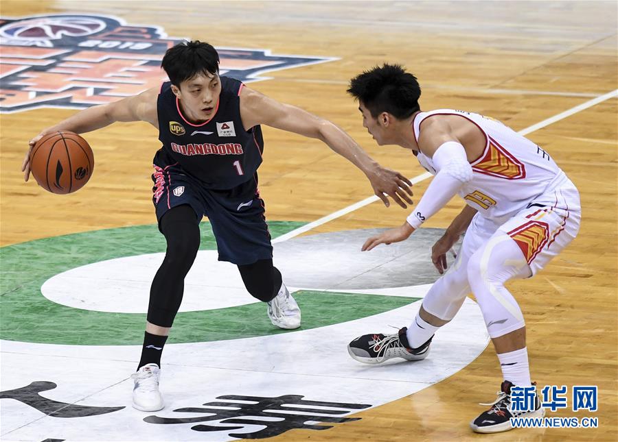 深圳马可波罗队球员于德豪(右)在比赛中防守广东东莞银行队球员胡明轩。新华社记者毛思倩摄