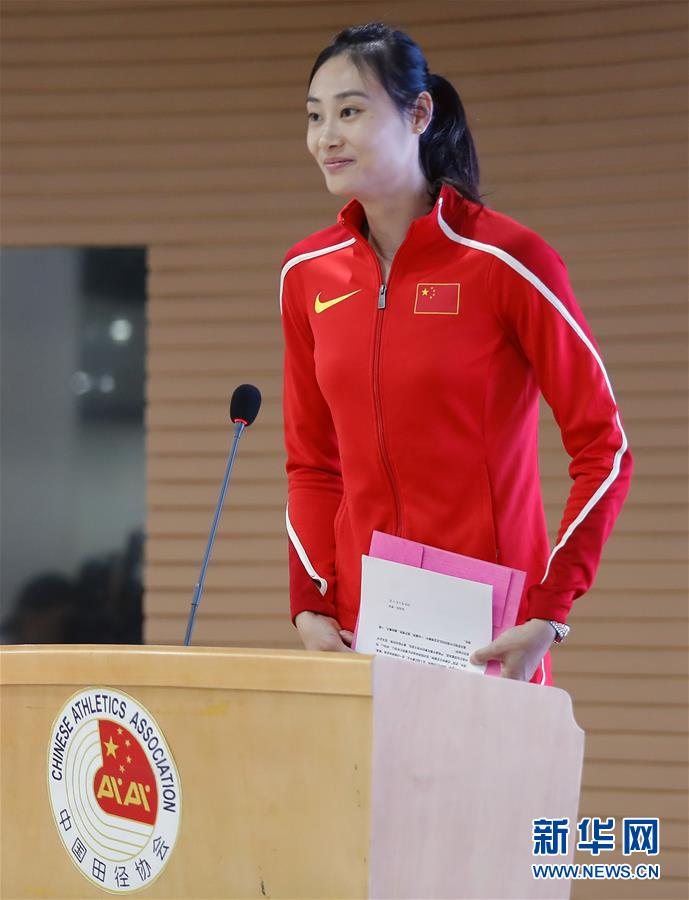 4月17日,运动员代表李玲在动员大会上发言。当日,2019年多哈亚锦赛中国田径队出征动员大会在北京国家体育总局举行。本次亚锦赛将于4月21日至24日在卡塔尔多哈举行。中国田径队11日公布了2019田径亚锦赛的参赛名单,共有包括苏炳添、巩立姣在内的89名运动员将参加本次赛事。 新华社记者丁旭摄
