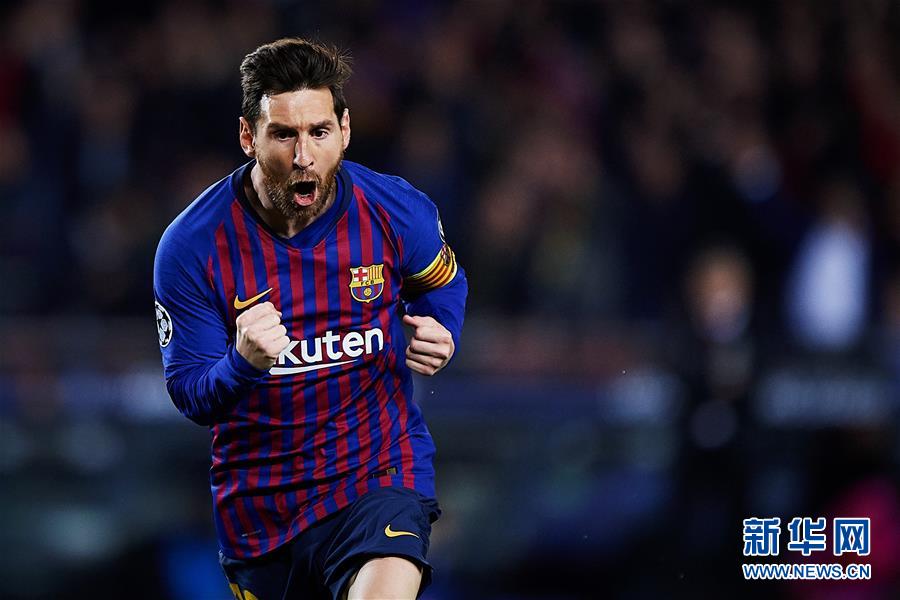 4月16日,巴塞罗那队球员梅西在比赛中庆祝进球。 当日,在2018-2019赛季欧洲足球冠军联赛四分之一决赛第二回合比赛中,西甲巴塞罗那队主场以3比0战胜英超曼彻斯特联队,从而以4比0的总比分晋级半决赛。 新华社发(胡安·戈萨摄)