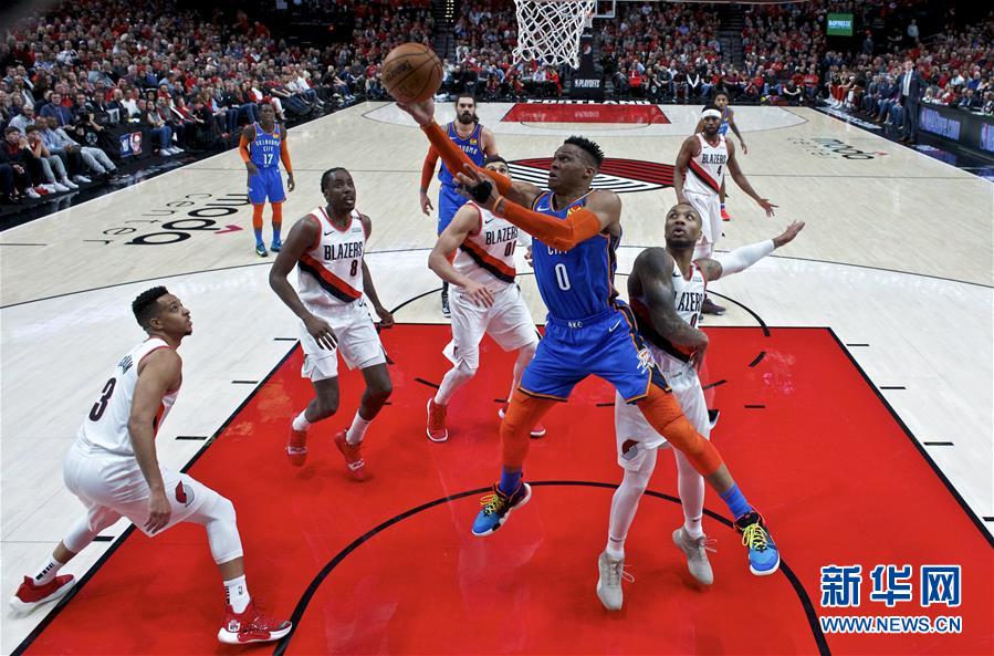 4月16日,雷霆队球员威斯布鲁克(前右二)在比赛中上篮。 当日,在2018-2019赛季NBA季后赛西部首轮第二场比赛中,波特兰开拓者队主场以114比94战胜俄克拉荷马雷霆队,以2比0的总比分暂时领先。 新华社/美联