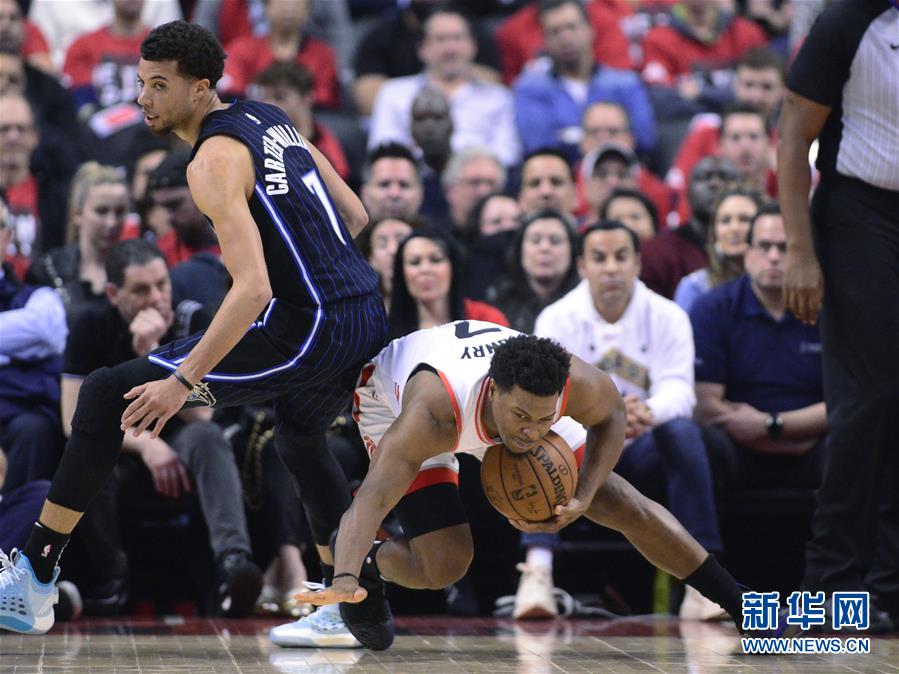 4月16日,猛龙队球员洛瑞(右)在比赛中和魔术队球员卡特-威廉姆斯拼抢。 当日,在2018-2019赛季NBA季后赛东部首轮第二场比赛中,多伦多猛龙队主场以111比82战胜奥兰多魔术队,双方总比分战成1比1平。 新华社/美联