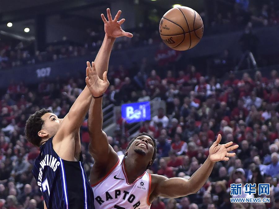 4月16日,猛龙队球员洛瑞(右)在比赛中和魔术队球员卡特-威廉姆斯拼抢。 当日,在2018-2019赛季NBA季后赛东部首轮第二场比赛中,多伦多猛龙队主场以111比82战胜奥兰多魔术队,双方总比分战成1比1平。 新华社/美联