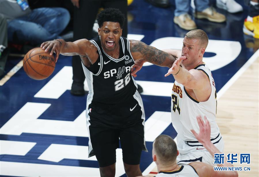 4月16日,马刺队球员盖伊(左)在比赛中救球。 当日,在2018-2019赛季NBA季后赛西部首轮第二场比赛中,圣安东尼奥马刺队客场以105比114不敌丹佛掘金队,双方总比分战成1比1平。 新华社/美联