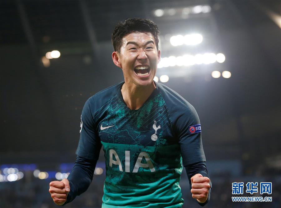 4月17日,热刺队球员孙兴民在比赛后庆祝。当日,在2018-2019赛季欧洲足球冠军联赛四分之一决赛次回合的比赛中,英超托特纳姆热刺队客场以3比4不敌英超曼彻斯特城队,双方总比分战成4比4平,热刺队以客场进球多的优势晋级四强。 新华社/路透