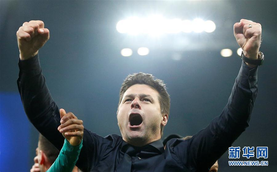 4月17日,热刺队主教练波切蒂诺在比赛后庆祝。 当日,在2018-2019赛季欧洲足球冠军联赛四分之一决赛次回合的比赛中,英超托特纳姆热刺队客场以3比4不敌英超曼彻斯特城队,双方总比分战成4比4平,热刺队以客场进球多的优势晋级四强。 新华社/路透