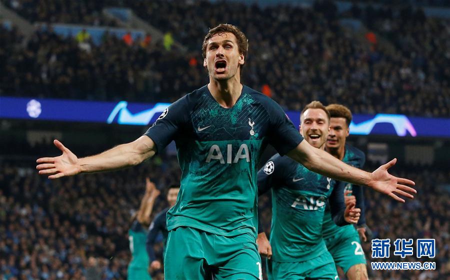 4月17日,热刺队球员洛伦特(前)为球队攻入第三粒进球后庆祝。 当日,在2018-2019赛季欧洲足球冠军联赛四分之一决赛次回合的比赛中,英超托特纳姆热刺队客场以3比4不敌英超曼彻斯特城队,双方总比分战成4比4平,热刺队以客场进球多的优势晋级四强。 新华社/路透